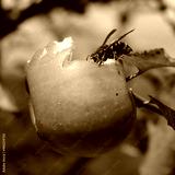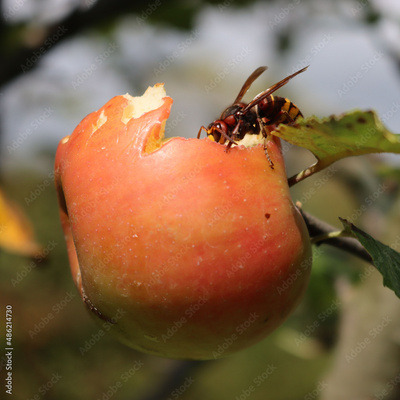 Close-up of Hornet wasp eating a red apple on branch in the orchard on a sunny day. Vespa crabro insect