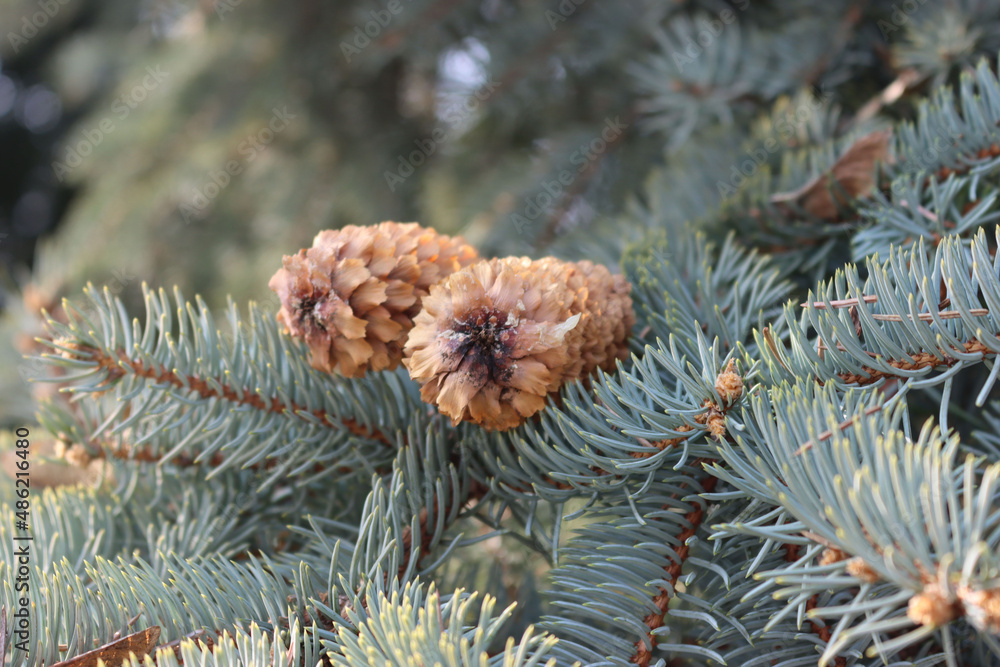 Branches of Picea pungens with brown cones. Colorado blue spruce with cones