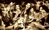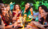 Happy friends having fun with fire sparkles while toasting red wine - Young millenial people camping at summer picnic barbecue party on night mood - Youth life style concept on warm vivid filter