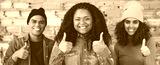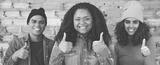 Laughing african american woman with multi ethnic friends shoing thumbs up