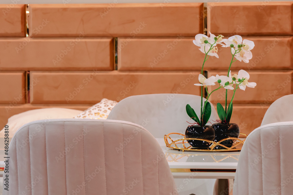 A white flower in elegant round flowerpots stands on a table against a brick wall.