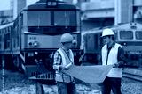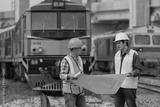 worker and engineer discuss job with locomotive on background. railways, engineer, worker, construction