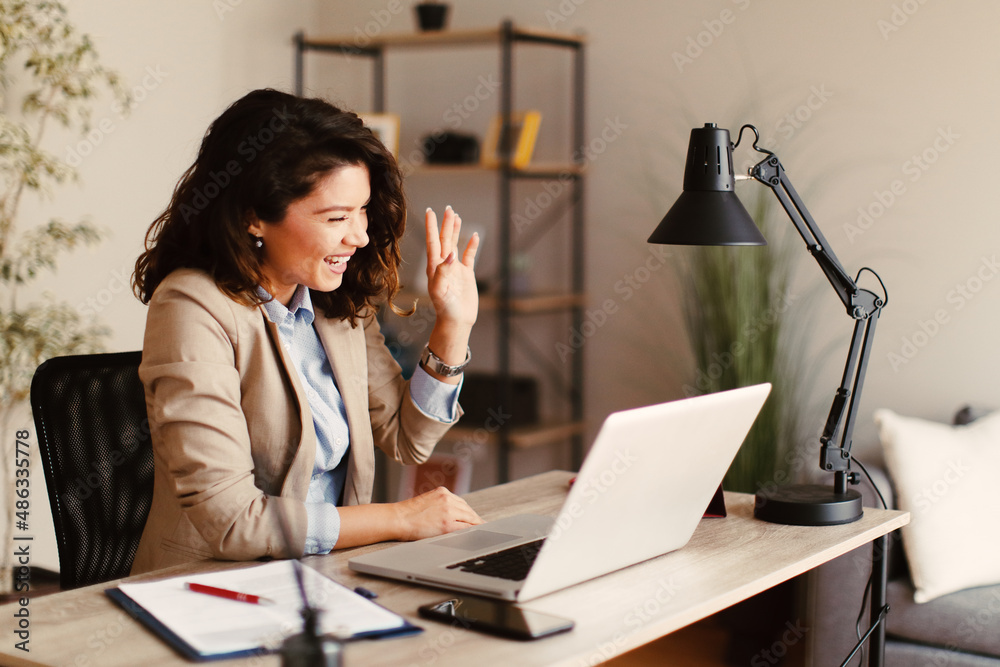 Young woman has a business conference via laptop at home