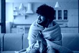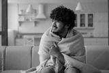 Sick unhappy Indian man covered with plaid blanket sitting in cold apartment looking away. Illness, quarantine, self isolation concept