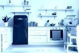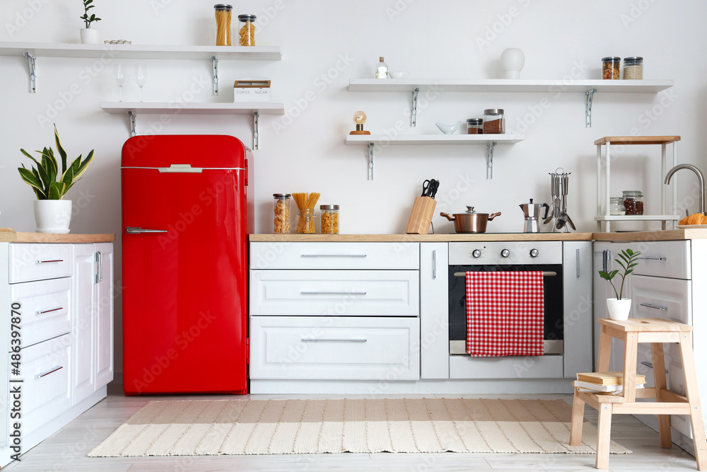 Interior of light kitchen with white counters and red fridge