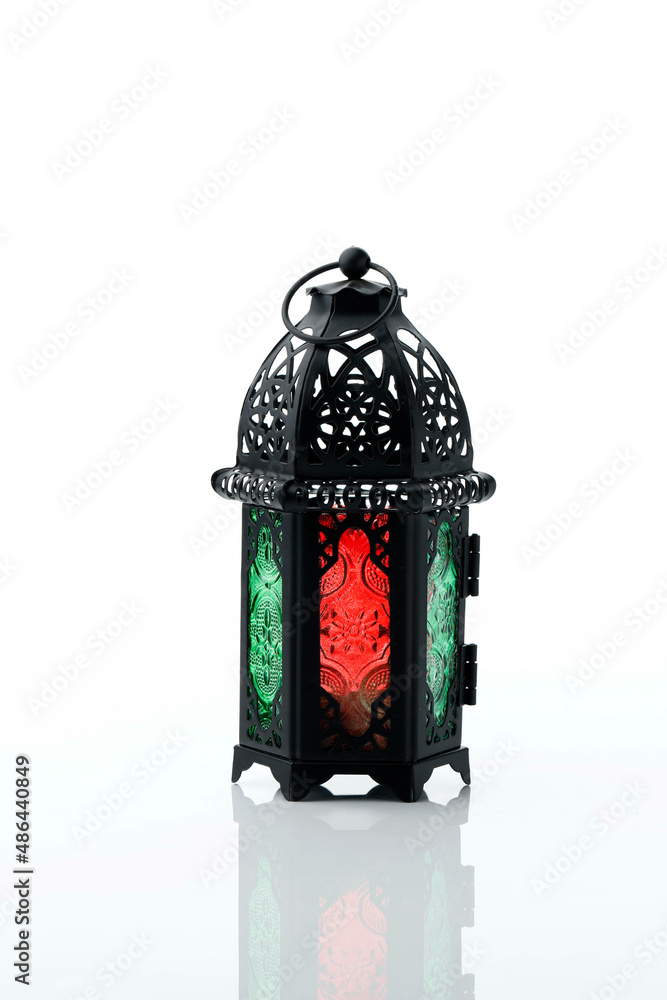 Ornamental Arabic lantern with burning candle glowing on white background.