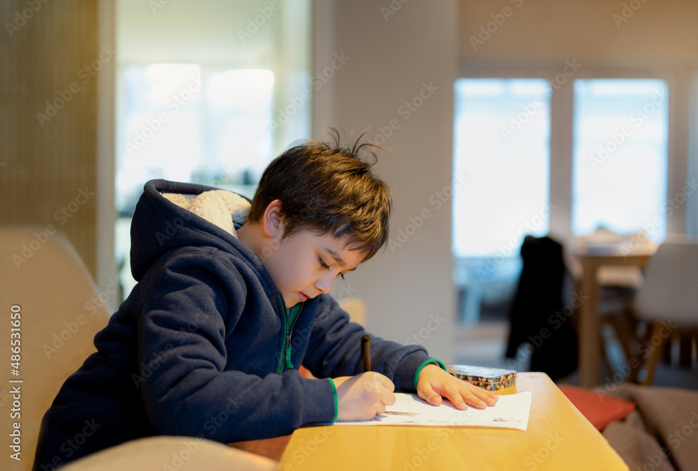 School kid using black pen drawing or writing the letter on paper, Young boy doing homework, Child with pen writing notes in paper sheet during the lesson.Cute pupil doing test, Homeschooling concept