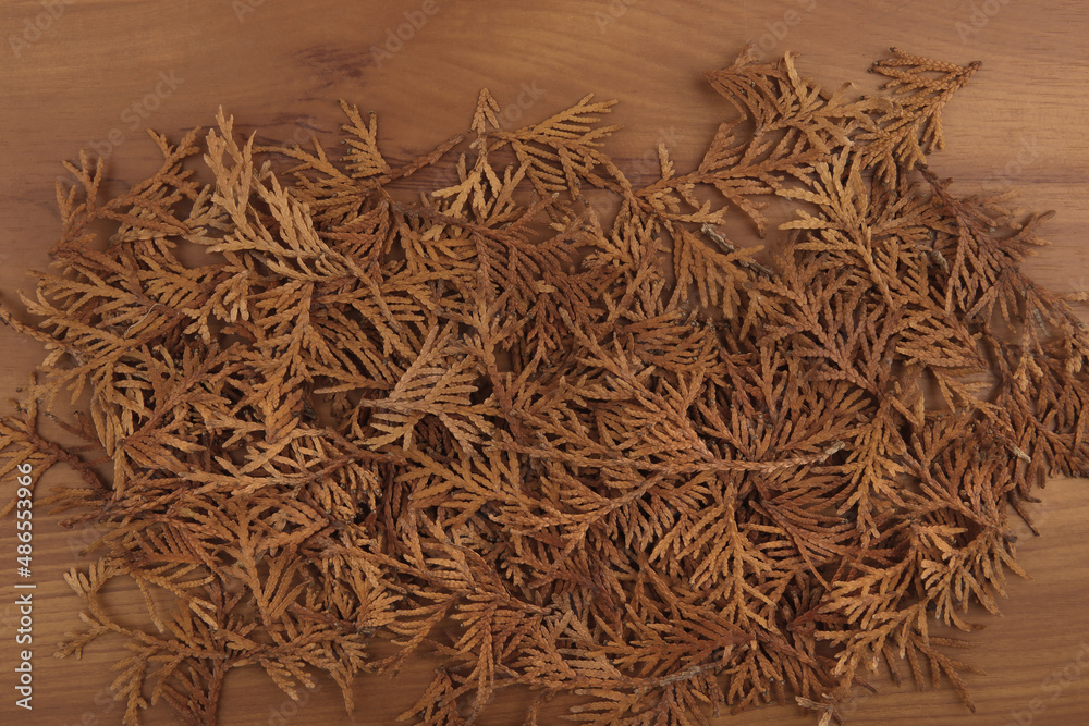 Dry leaves of thuja tree on wooden background. Pattern of dried thuja branches, texture of fallen dead leaves.