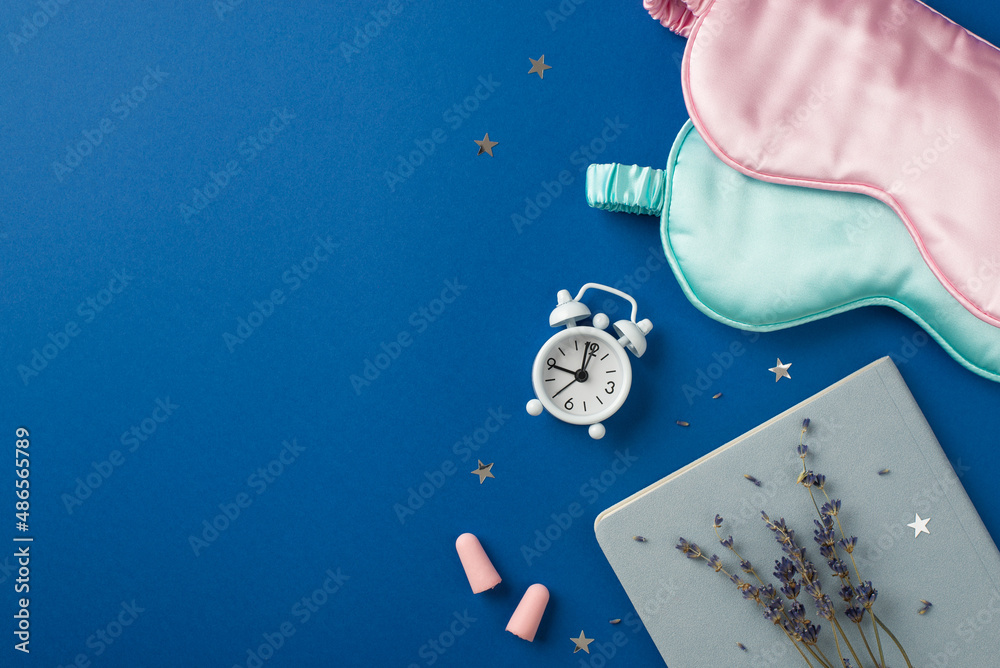 Top view photo of two silk masks pink blue one white alarm scattered confetti in shape of stars copybook a bouquet of lavender and two pink earplugs on the deep blue isolated background copyspace