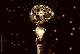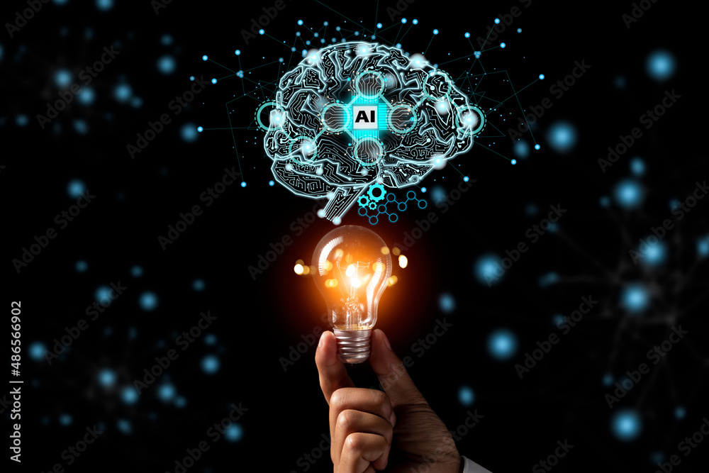 Man holding bulb lamp nad Brain with printed circuit board artificial intelligence AI