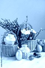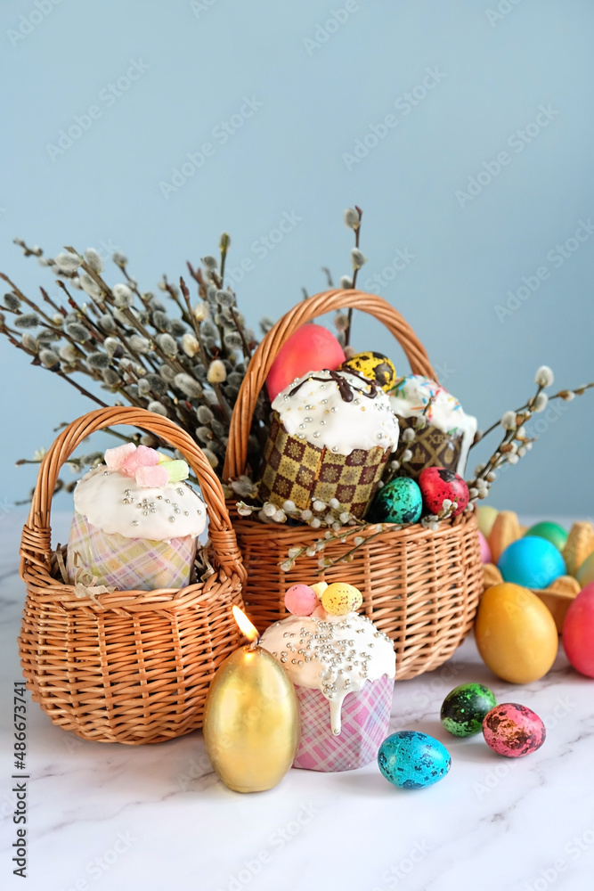 Easter cakes (kulich), candle, colorful eggs and willow branches on table. Easter holiday Festive composition.