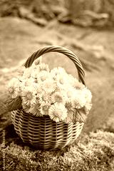 fresh spring coltsfoot flowers in wicker basket outdoor, natural background. Healing plant coltsfoot (Tussilago farfara) used in traditional medicine. first flowers of early spring season