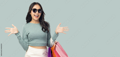 Beauty young woman wear sunglasses and holding shopping bags with surprise face and expression face shopping concept Beautiful asian girl get cheerful Smile face Pastel green background copy space