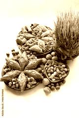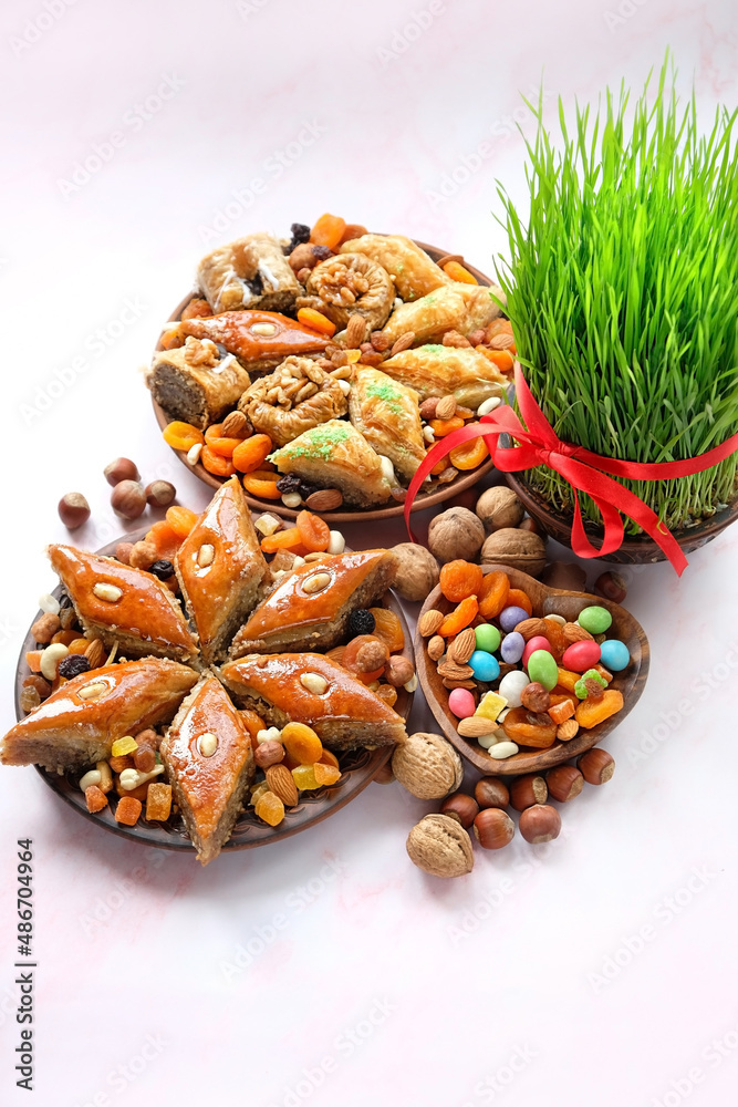 Nowruz festive table. green wheat grass with red ribbon, arabic dessert baklava, sweets, nuts, dry fruits. Traditional celebration of spring equinox in March, Nowruz Holiday