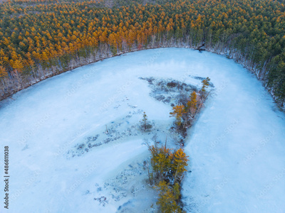 aerial view of forest and frozen river in winter