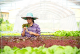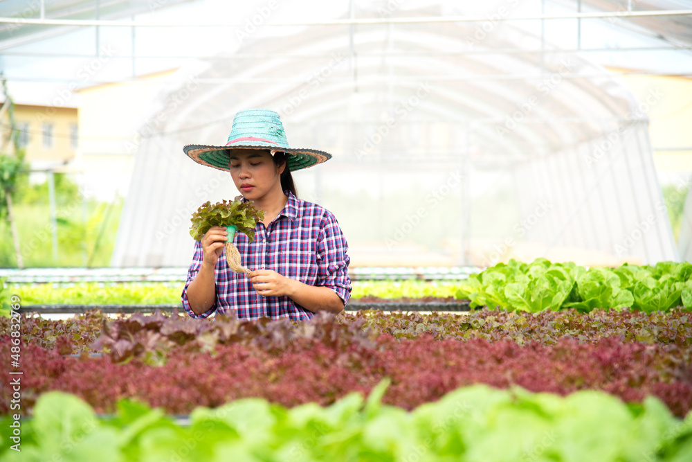 Beauty Asian woman farmer owner with smile holding hydroponic vegetables and checking organic plant growing in farm.Small business entrepreneur concept