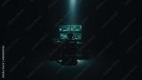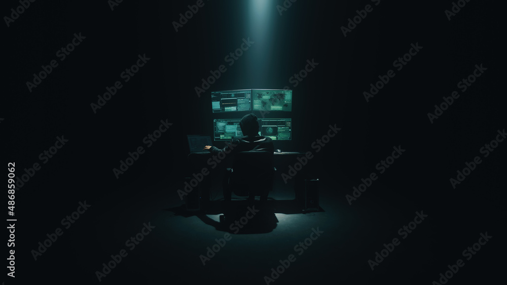 Anonymous hacker in hood cracking secret files on a computer in a dark underground hideout at night