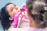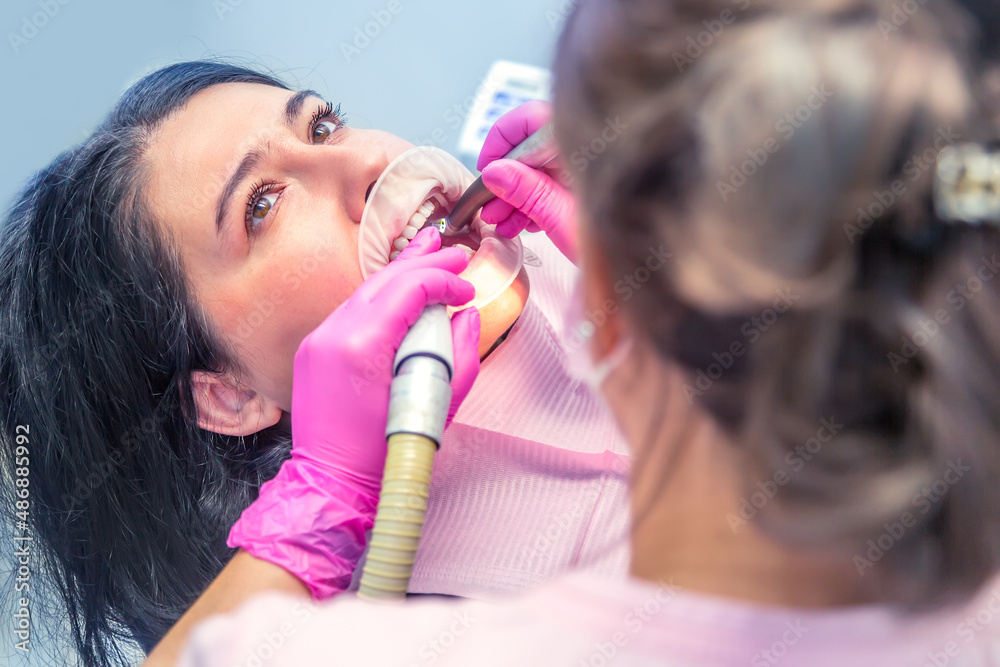 Female dentist curing a woman patient. Dental clinic and dentist appointment concept.