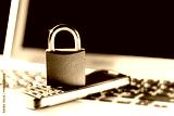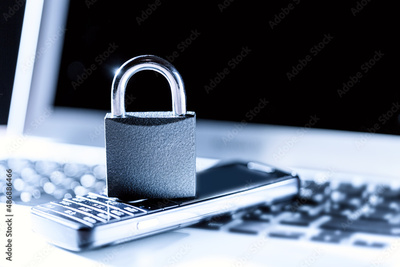 Padlock on laptop and old mobile phone. Internet data privacy information security concept. Antivirus and malware defense.