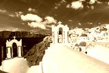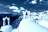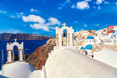 Oia village with famous white houses and blue churches on Santorini island, Aegean sea, Greece.