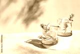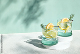 Summer refreshing lemonade drink or alcoholic cocktail with ice, rosemary and lemon slices on pastel light green surface. Fresh healthy cold lemon beverage. Water with lemon.
