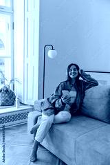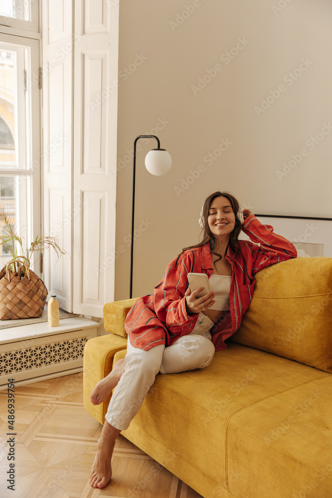 Cute slim model in casual clothes is sitting in living room listening to music on headphones. Smiling brown-haired woman having fun at home alone. Lifestyle leisure and beauty concept.