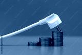 Concept of rising electricity prices. AC power plug and coins.