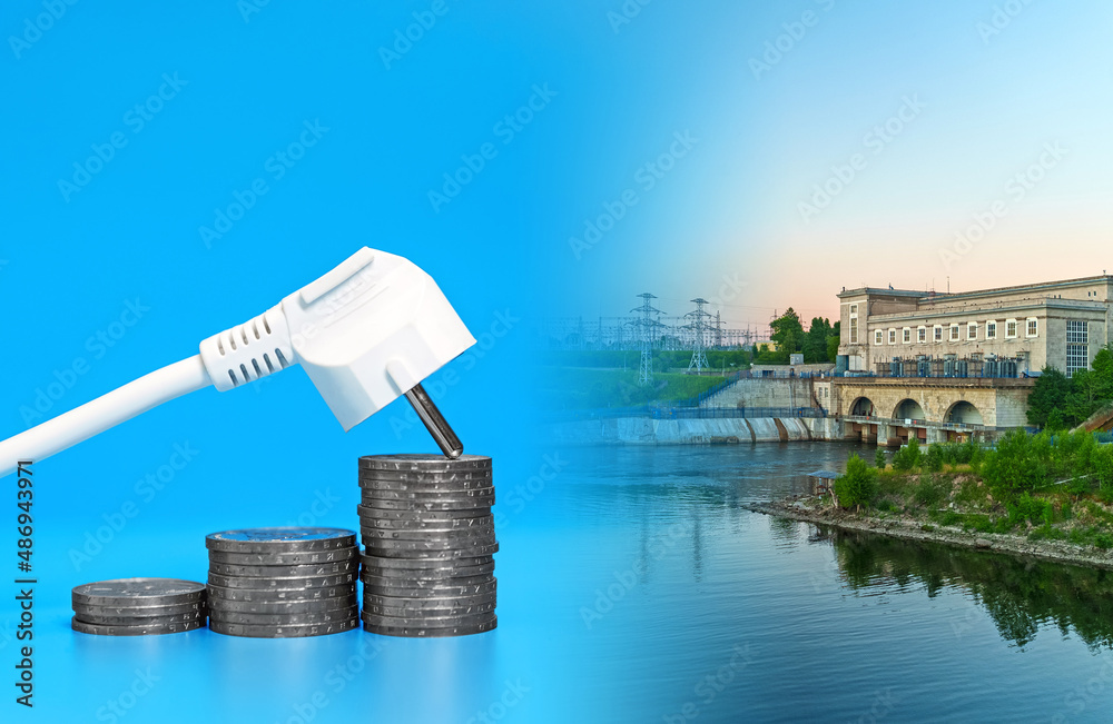 Renewable energy concept. Hydroelectric power plant and coins with AC power plug.