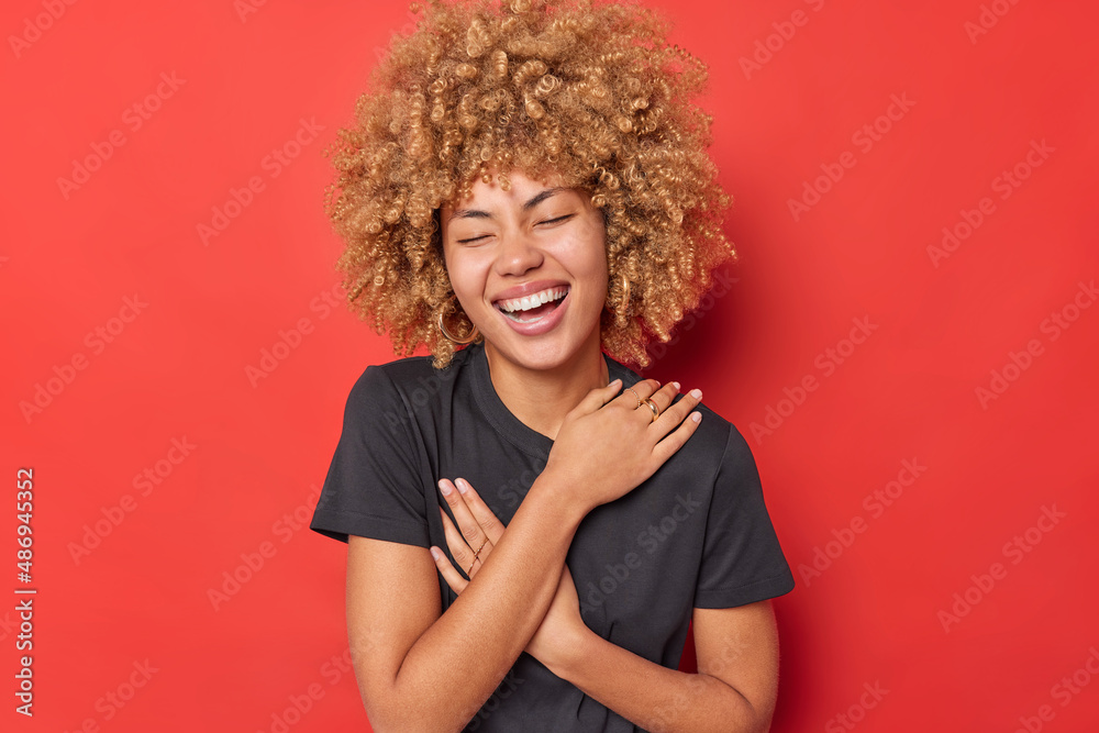 Happy carefree woman keeps arms crossed over chest laughs sincerely smiles broadly keeps eyes closed wears casual black t shirt poses against vivid red background. Positive emotions concept.