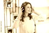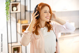 Young beautiful redhead woman wearing headphones listening to music while dancing at home.