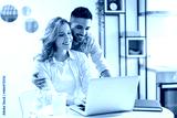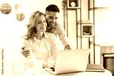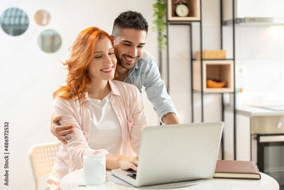 Smiling couple looking at laptop together at cozy home office.