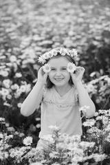 Portrait of a cute village girl in a wreath of daisies in a meadow. He holds a flower in his hands in front of his face. A child on a blooming chamomile field.