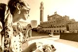 Woman having italian breakfast with coffee and croissant, sitting at outdoor cafe with beautiful view on main square of Siena city. Concept of italian lifestyle and travel old towns in Tuscany