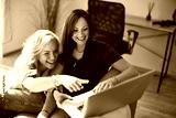 Two young beautiful women sitting on sofa and using a laptop and laughing