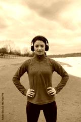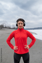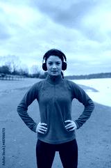 Attractive ypung runner wearing headphones listening to music while running by the river in the cold winter morning training for a marathon. Healthy lifestyle concept.