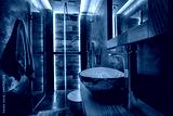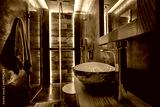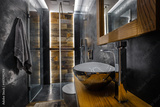 Stylish dark bathroom interior with shower. Tiles imitating wood on the floor and on the wall