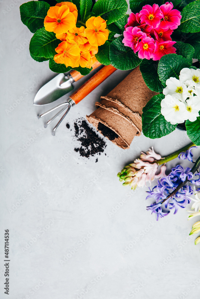 Gardening background. Hyacinth and primula flowers with garden tools on gray stone background.