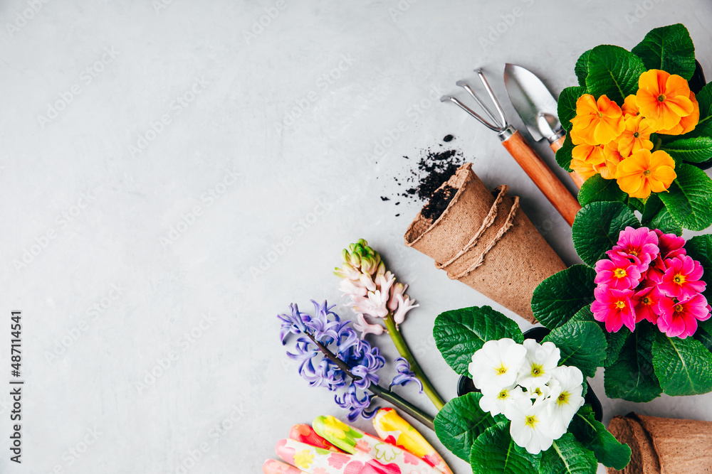 Gardening background. Hyacinth and primula flowers with garden tools on gray stone background.