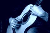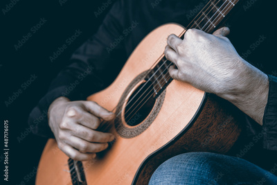 The guy in the dark shirt is plucking the strings of a six-string guitar