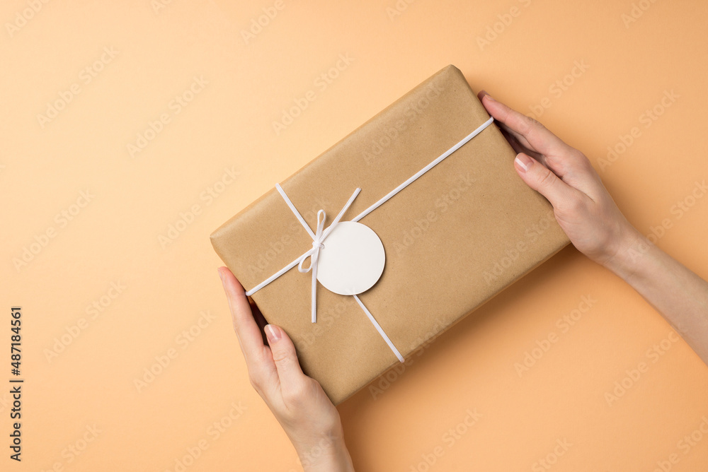 First person top view photo of saint valentine's day decorations woman's hands giving craft paper giftbox with small bow and tag on isolated beige background with copyspace