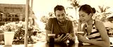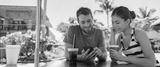 Friends or interracial couple dating talking at coffee date sitting at cafe table using mobile phone app pictures drinking coffee in summer. Young man using smartphone smiling happy to Asian woman.