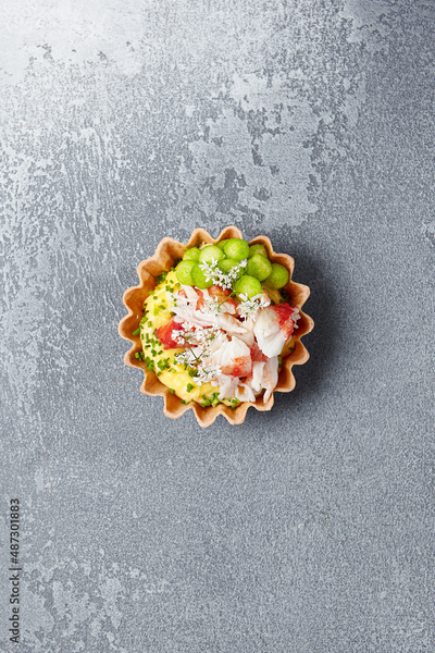 Appetizer with crab on white table with hard shadow. Food and wineglass shadow. Tartlet with seafood in fine dining. Lifestyle summer food.