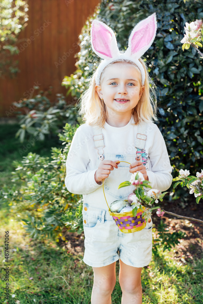 Adorable little girl wearing bunny ears holding a basket with Easter eggs outdoors on spring day. Kid having fun on Easter egg hunt. Children searching for eggs in the garden. Selective focus