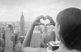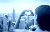 New York Tourist doing heart shape with hands gesture at NYC skyline view from rooftop. View from behind, USA Travel vacation destination.