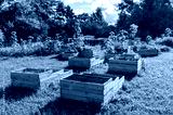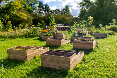gardening, farming and planting concept - raised garden beds made in wooden boxes on summer farm