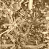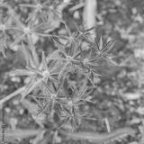 Flowering culantro recao (Eryngium foetidum) plant with green seed pods end of the stems at organic backyard garden near Dallas, Texas, USA