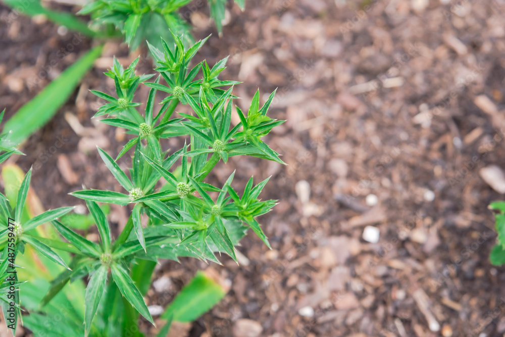 Blossom Eryngium foetidum or culantro recao plant on brown soil compost background at organic garden near Dallas, Texas, USA