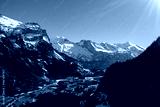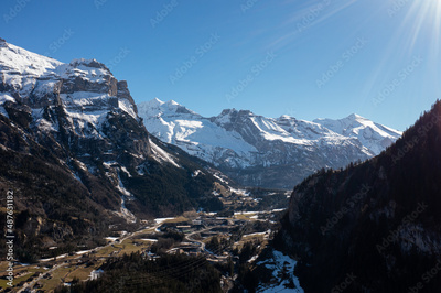 Amazing shot of a beautiful landscape in the alps of Switzerland. Wonderful flight with a drone over an amazing landscape in the canton of Bern. Epic view over a lake called Blausee.