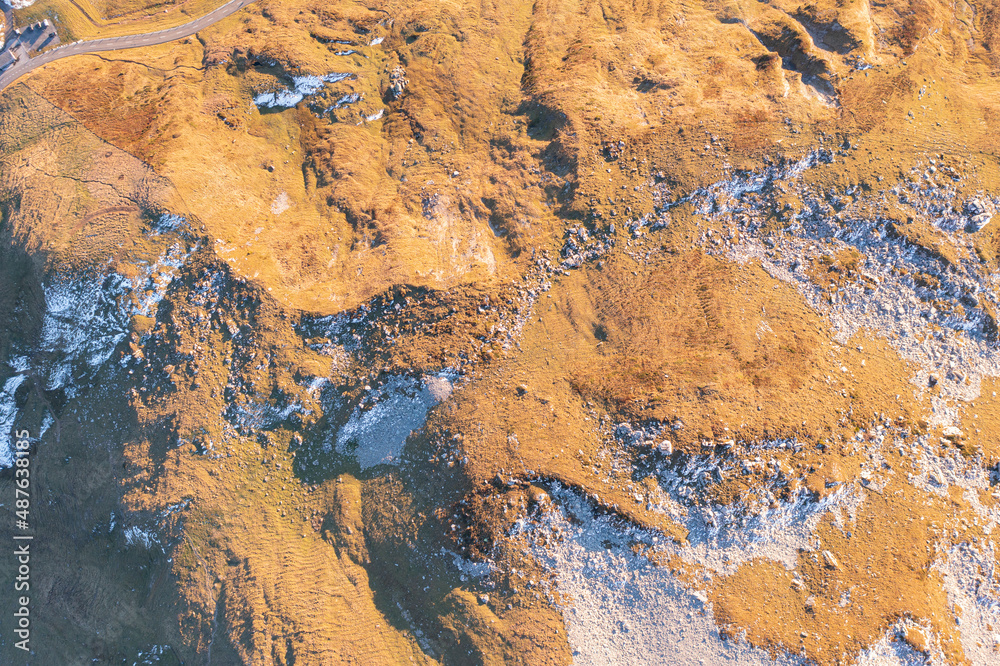 Amazing sunset in the alps of Switzerland. Wonderful flight with a drone over an amazing landscape in the canton of Uri and Glarus. Epic view over a street called Klausenpass.