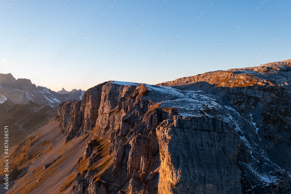 Amazing sunset in the alps of Switzerland. Wonderful flight with a drone over an amazing landscape in the canton of Uri and Glarus. Epic view over a street called Klausenpass.